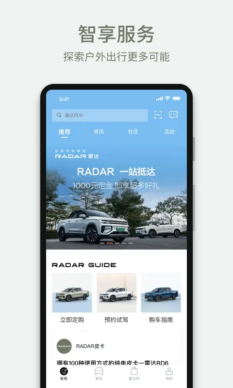 如果你想知道吉利雷达纯电皮卡的价格,相关软件能帮到你。像吉利雷达App就很不错,它是车主专享软件。在这里,你能全面了解雷达新能源汽车的官方动态、产品资讯,获取实用用车指南。能参与多样化用户体验活动,发现多元户外生活方式。还能了解汽车核心技术亮点,个性化配置订购爱车,一键预约试驾。通过它的商城,能随心选购车辆精品配件和品牌生态联名周边。首页的推荐、资讯、社区、附近和活动版块,能满足你的各种需求。比如在资讯版块可了解车辆信息,授权定位能搜寻附近好去处,还能查看最新款并预约试驾。有了它,你就能轻松知晓吉利雷达纯电皮卡的价格等信息,还能享受便捷的汽车管理和丰富服务,快来下载体验吧。