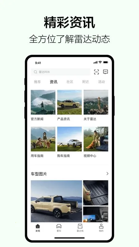 1. 资讯丰富:能全面了解雷达新能源汽车官方动态、产品资讯及用车指南,各类信息随时查询。