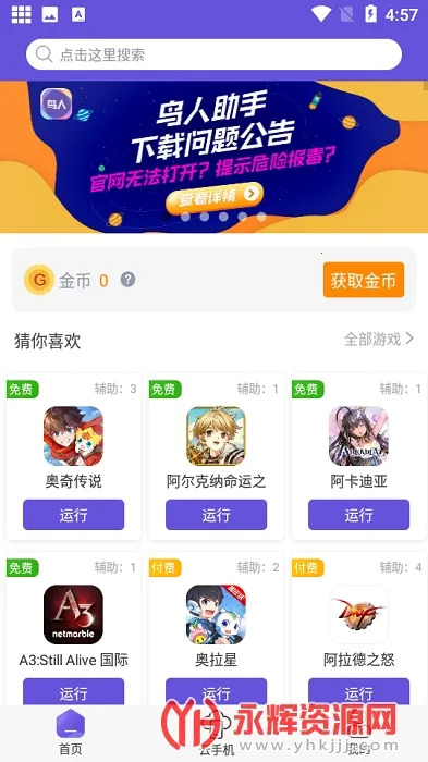 鸟人助手手游辅助是一款超棒的游戏辅助平台。它无需root手机就能使用,绿色又安全。这里网罗了千款免费辅助,为99热门经典手游提供海量免费辅助下载,像提灯与地下城、热血传奇等都有。有后台挂机黑科技,不占手机内存就能挂辅助,游戏挂机两不误。软件功能强大,能全局加速,可随心调节倍速;战斗能跳过,包括未打过的副本;智能答题自动显示正确答案。还能管理游戏,一键启动自动匹配手机里的游戏。海量单机游戏随便下,还有各种存档让你变身游戏达人。手游脚本随意挑,能帮你打造效率升级之路。想轻松玩游戏、快速获取奖励、节省时间,就来试试鸟人助手手游辅助吧,真的超便利!