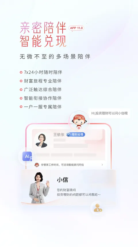 4. 无微不至的多场景陪伴,7x24小时随时陪伴,财富旅程专业陪伴,广泛触达综合陪伴,智能衔接协作陪伴,一户一服专属陪伴。