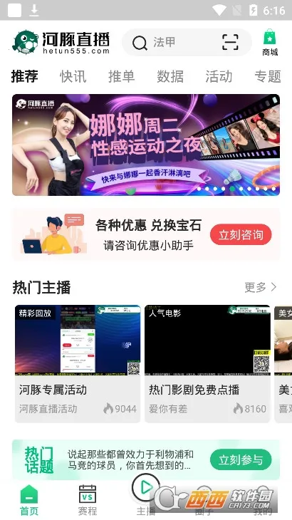 河豚直播是体育直播平台,提供高清直播,覆盖全球各大联赛。有免费无广告转播,粉丝交流区,专业美女主播。还有热门推荐、数据记录、赛事分类等功能,能回看精彩,提供实时情报。