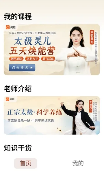 1、打开太极讲堂app,进入软件首页,可查看我的课程老师介绍等