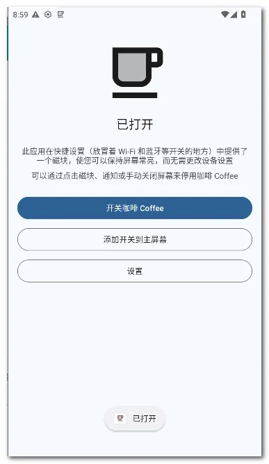 咖啡Coffee安卓应用能让屏幕常亮,无需改设备设置,可在快速设置板块、应用内按钮等位置切换功能,支持Android7或更高版本,还能设为辅助应用,有故障排除措施。