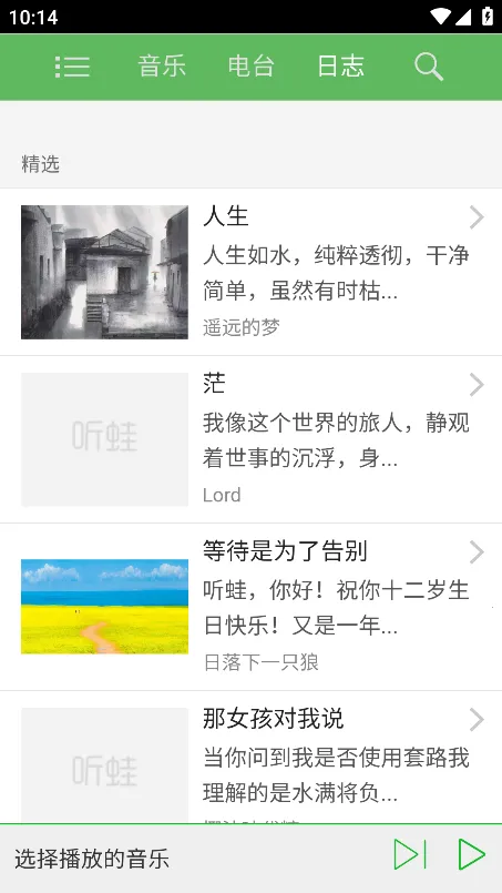 听蛙最新手机版是小众音乐分享平台,有海量曲库,能精准推荐,一键收藏。可按多维度搜索音乐,每日精选推荐,还有电台、音乐日志等功能,百万歌曲畅听,满足多样需求。