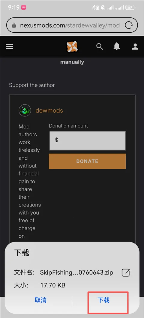 2、然后再搜索栏中搜索自己想要的mod下载,以钓鱼mod为例,搜索skip fish。