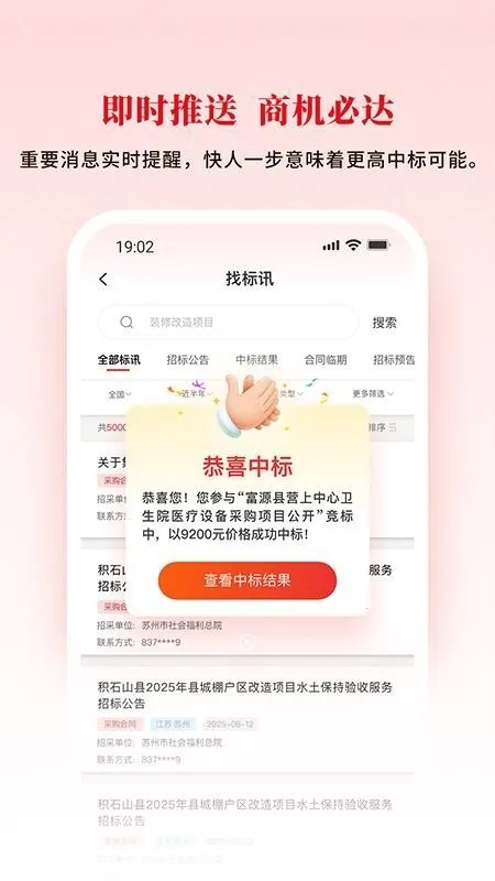 2. 即时推送,商机必达:重要消息实时提醒,快人一步意味着更高中标可能。