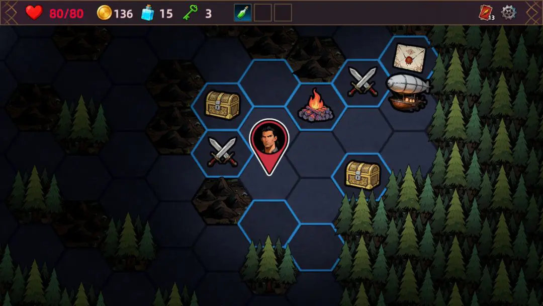 4. 游戏的六边形地图探索灵活多变。在迷雾大陆自由探索,寻找宝藏与秘密,高容错率机制鼓励冒险,逐步揭开大陆面纱。