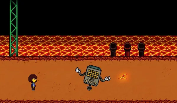 4、去到北面的藤蔓房间内会遇到青蛙froggit,选择“行动——赞美”,虽然青蛙不知道玩家在说什么,但他变得很开心,他就会逃离战斗。在右面的水池上有一个尖刺陷阱,Toriel会牵着玩家的手通过这个陷阱区域。