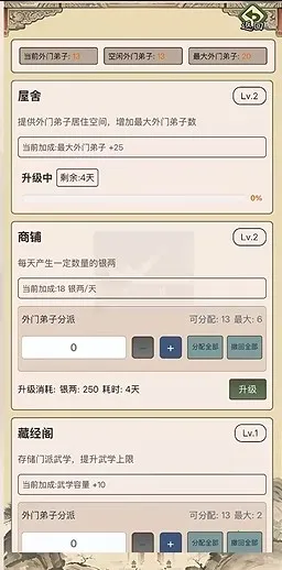2. 资源管理至关重要,要合理规划银两流动,积累门派声望,悉心培养内门核心弟子与外门劳作弟子,让门派在江湖中站稳脚跟并逐步壮大。