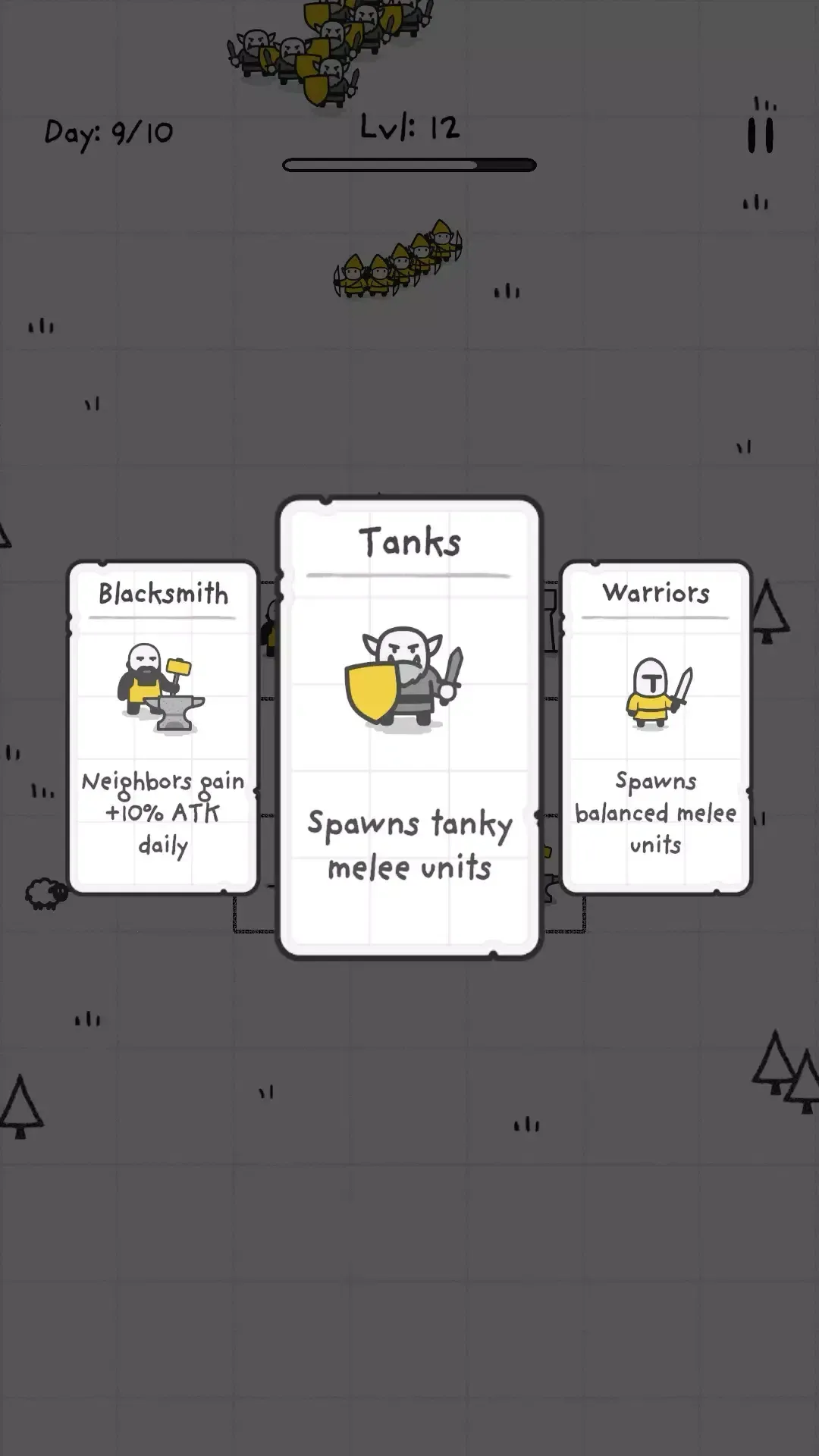 1. 拥有独特的三选一升级系统,每波敌人过后可从三张卡牌中选一张强化或解锁新单位,让游戏独一无二。