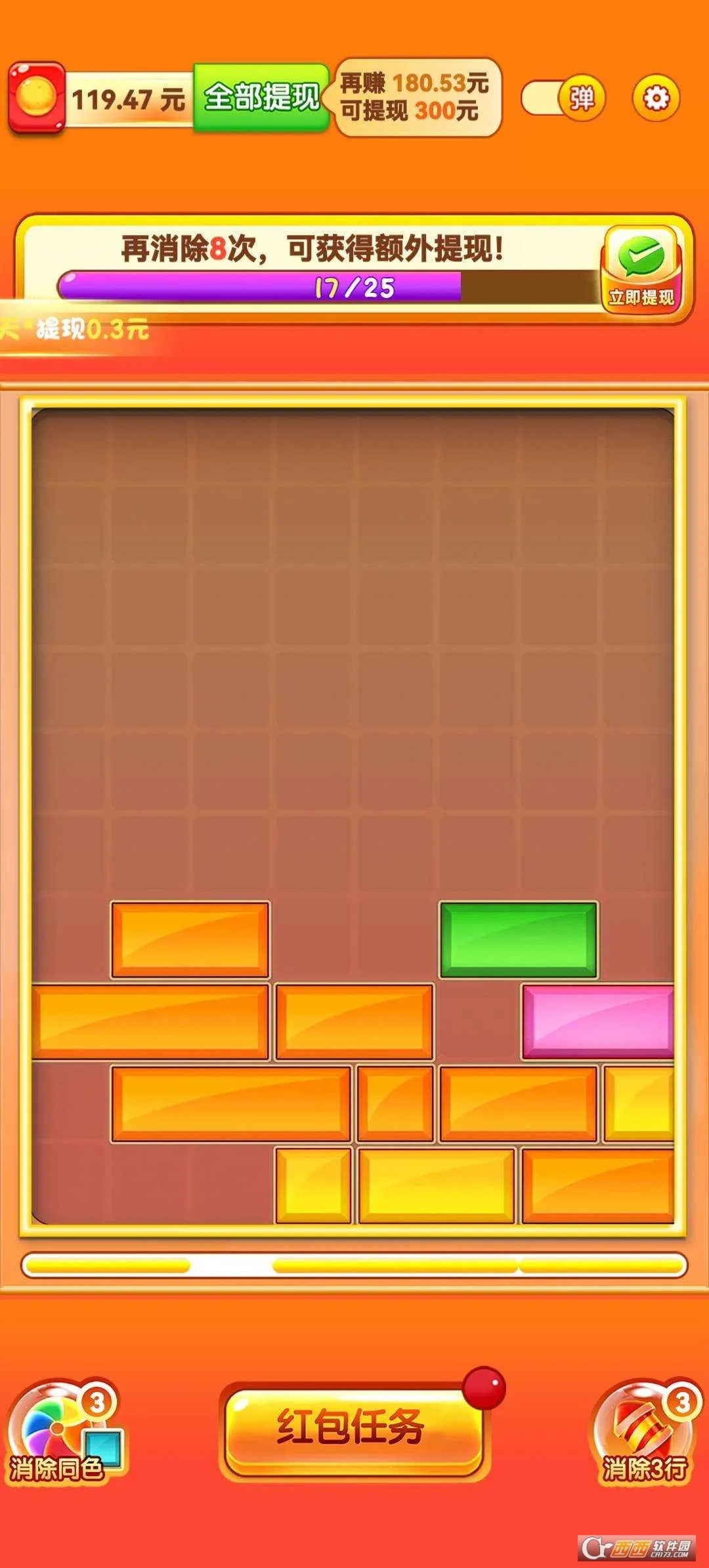 金猪送福是一款超有趣的休闲闯关游戏哦!它的玩法简单易懂,只要点击屏幕消除方块就能闯关,还能拿到红包奖励,轻松挣零花钱,特别适合喜欢休闲游戏的朋友。进入关卡后,留意倒计时,从不同角度消除方块加快速度,熟悉规则后还能试试多人模式。这款游戏娱乐性超强,每次玩都能享受愉快氛围,动感音乐很带劲。红包奖励实实在在能直接提现。它适合人群广,小朋友和老人都能快速上手。画面丰富,色彩冲击感强,不限制玩耍时间和地点。游戏里没有复杂步骤,点击屏幕消除超爽快,还有炫酷特效。另外,它还有多种玩法模式,像普通、时间、挑战、颜色模式等,关卡多样有难度有挑战,完成任务能得金币、道具等奖励。快来试试,让你在游戏中享受乐趣还能收获惊喜!