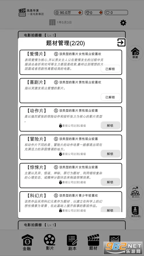 2、题材与剧本丰富,有20多种电影题材和上百部电影剧本,玩家可自由解锁、选择并拍摄不同故事情节剧本。
