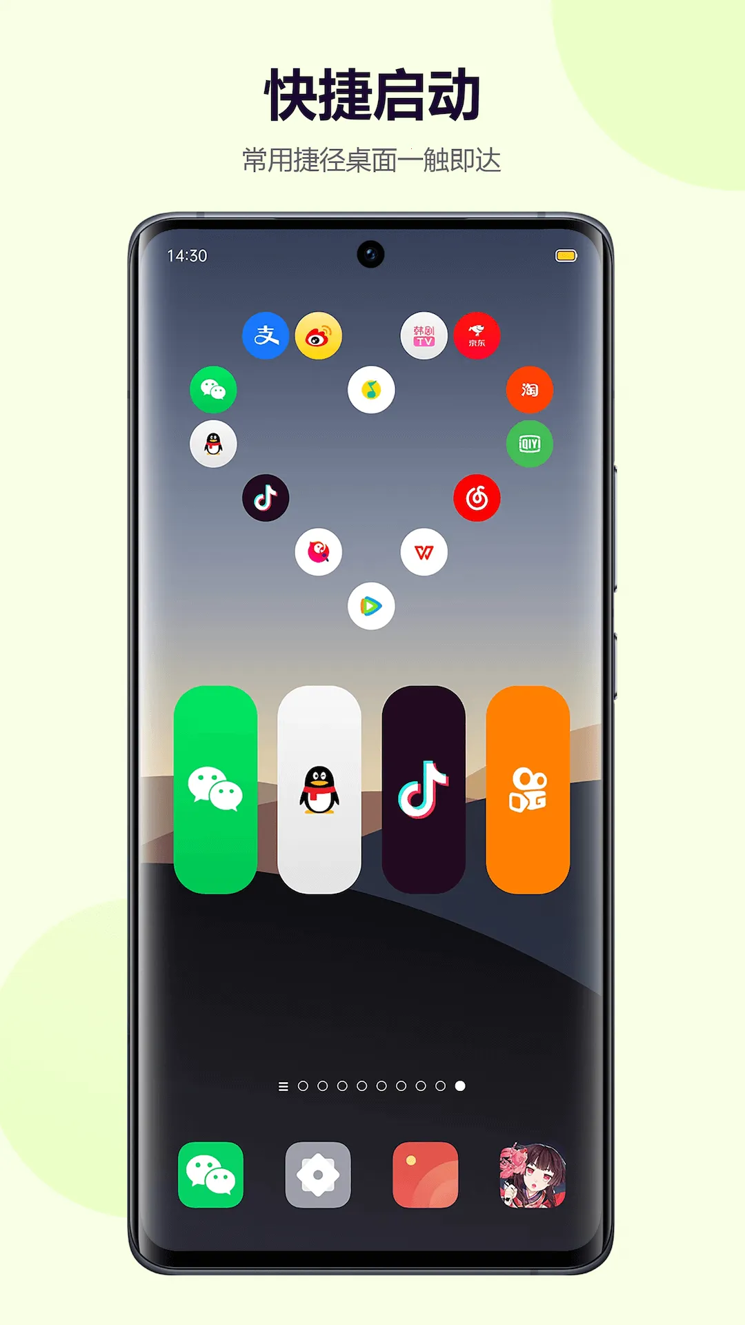 2. 快捷启动便捷:涵盖游戏快捷方式、各种扫一扫、乘车码、付款码、微博热搜等,实现桌面点击一键直达常用功能。