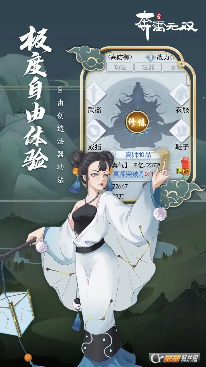 还有丰富玩法,比如勇者之路能让你文武双全,有多样挑战副本、秘境探险、竞技场PK等。挂机就能积累真气提升实力,各种秘籍天赋等你点亮。快来下载奔雷无双,书写你的修仙传奇吧!