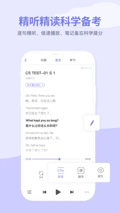 3. 软件内置中英翻译、精听精读、生词笔记等多种科学备考工具,助力打造高效备考体验。