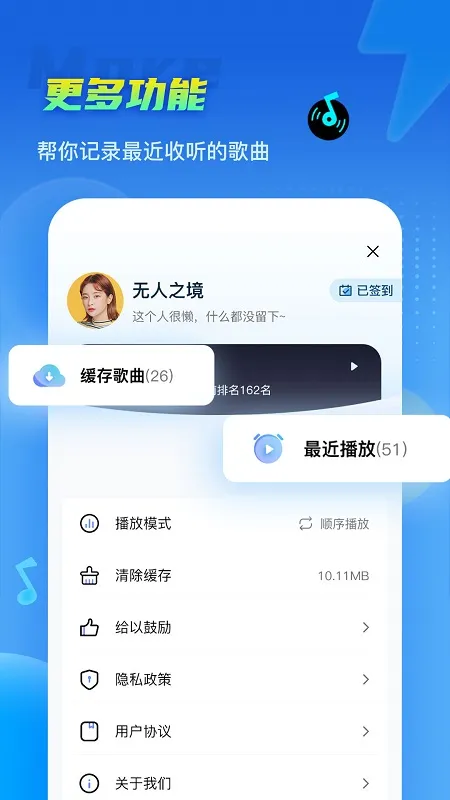 3、功能丰富实用,能打造专属串烧音乐,还可记录最近收听歌曲,炫酷播放合并界面方便操作,一键搜索功能让找歌更便捷。