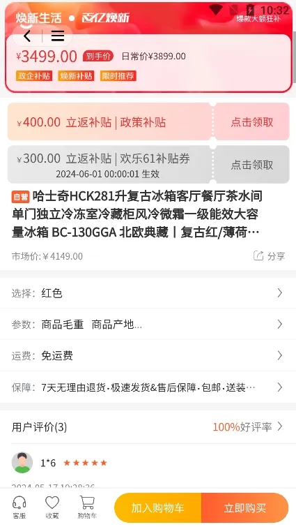 3、补贴福利丰厚,有补贴返现且极速到账,还有政企联合补贴,部分用户有机会获得双重补贴,购物更实惠。