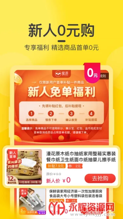 3、新人福利优厚:新人注册可享受首单0元购福利,新人免单专区每日更新数十款宝贝,0元即可带回家。
