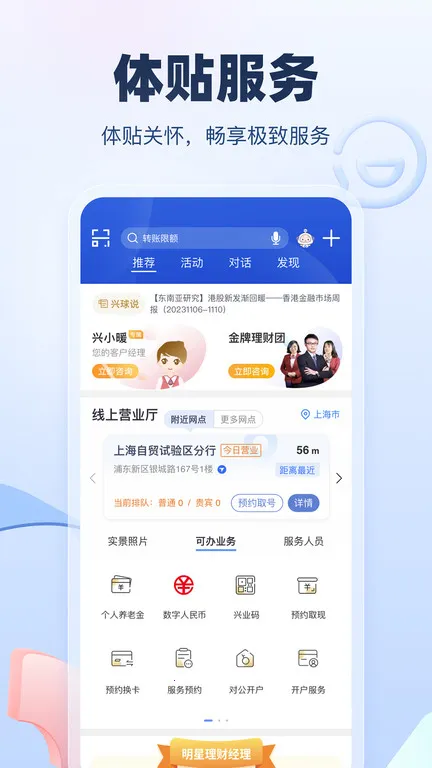 2. 提供贴身金融服务,涵盖查询转账、投资理财、信用卡等多项业务,各类金融产品一应俱全。