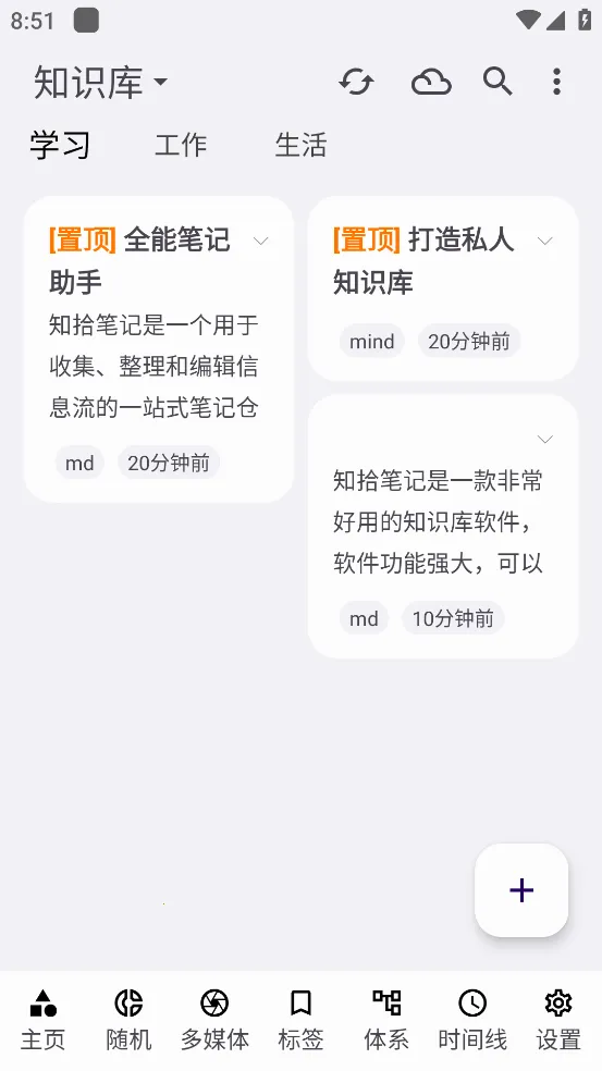 2. 软件的分类与管理功能多样。支持分类标签扁平化分类管理,也能通过树状图立体构建知识体系,还提供随机阅读、时间线标签、多媒体等多维度内容管理方式,方便用户根据自己的需求对知识进行精准分类和查找。