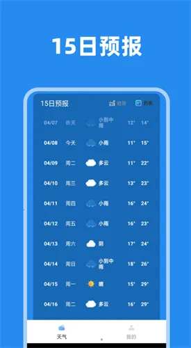 大邱天气先知是精准天气预报软件,能查当地实时及未来多天天气,不限地点,数据权威。有15日预报、空气质量检测等功能,可多城市切换,提前安排出行,还能获生活指导。