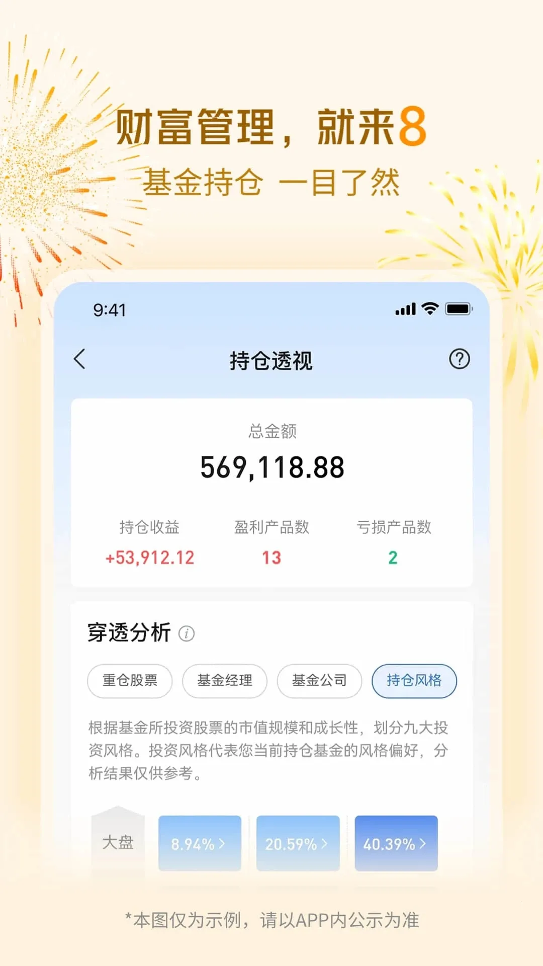 2. **理财高效**:产品丰富多样,可投用户所好,轻松挑选,还支持一键分享。智能筛选理财产品工具,输入金额和期限就能一键速配最优产品。