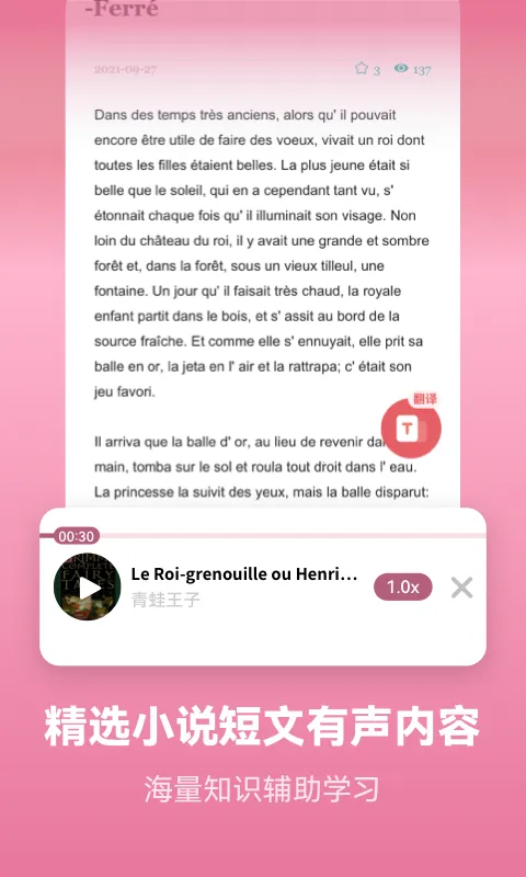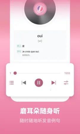 2. 提供标准地道的法语发音示范,并支持录音跟读与AI评测,帮助用户从一开始便纠正发音细节,还内置完整的法语发音教学模块,详细讲解字母音素及发音规则,并配有跟读对比练习。