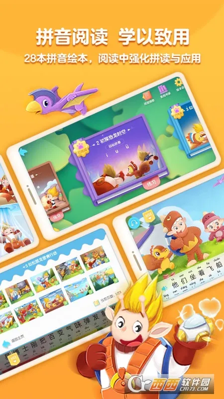 3. **科学闭环**:结合拼音音形设计丰富的创意互动场景,将动画、儿歌等多种形式相结合,玩、调、读、说、拼等9大环节,让孩子更好地理解拼音,形成科学的学习闭环。
