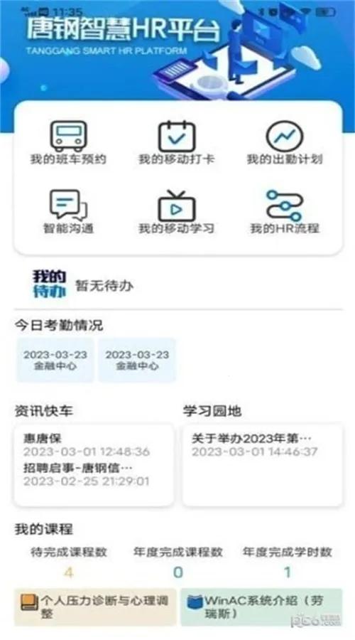 智慧唐钢是为唐钢人事办公室设计的办公软件,可线上智慧管理与办公。能查考勤、班车等信息,进行合同管理,还有移动学习等功能,含员工关爱、转正离职流程等特色,提高管理部门工作效率。
