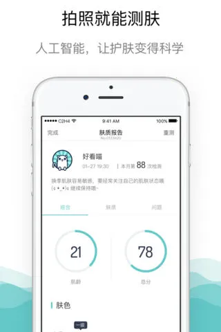 1. 该软件使用方便,只需简单拍照就能从多个角度进行专业肤质检测,如肌龄、肤色、出油、痘痘、黑头、毛孔、光滑度等。