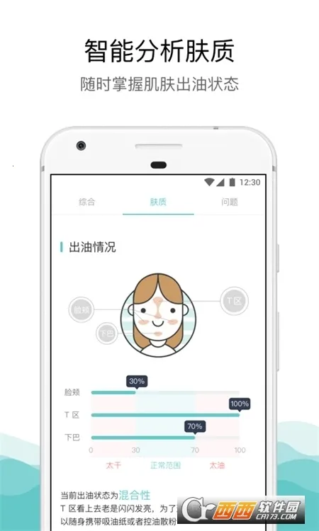 2. 检测角度全面,从肌龄、肤色、出油、痘痘、黑头、毛孔、光滑度等多方面分析肤质。