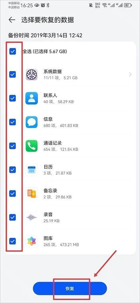 4、最后选择需要备份的数据并点击恢复即可。