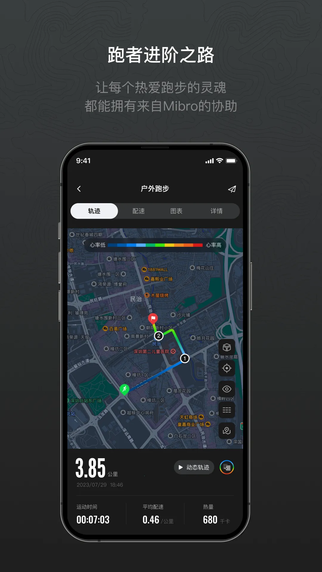 1. **精准记录运动数据**:Mibro Fit能精确记录走路、跑步、骑行等运动,低功耗计步,让跑步轨迹、心率、步频、配速等数据清晰呈现。