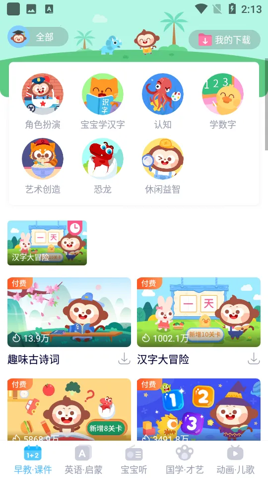 1. **内容丰富多元**:涵盖学数学、学汉字、幼儿认知、艺术创造、角色扮演等多款精美小课件,还有海量英文儿歌、正版英文动画片,以及故事、国学、才艺学习等资源,让孩子在动漫人物引导下学知识长见识。