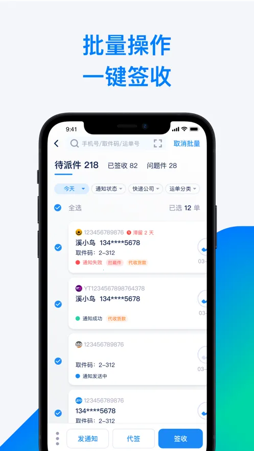 1. **操作便捷**:支持批量扫描运单号,自动识别快递公司名称与特殊运单,同步路由信息,极大提高派件效率。扫描运单号和手机号入库,结合OCR识别技术,大部分运单扫描后直接带出手机号,入库效率更高。