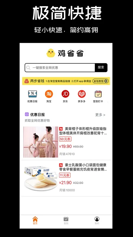 鸡省省app是扬州码客教育科技有限公司开发的优惠领券购物平台,涵盖主流电商平台隐藏券,衣食住行优惠全,有返利、打卡福利,支持多方式搜索,提现0手续费,无广告,体验好。