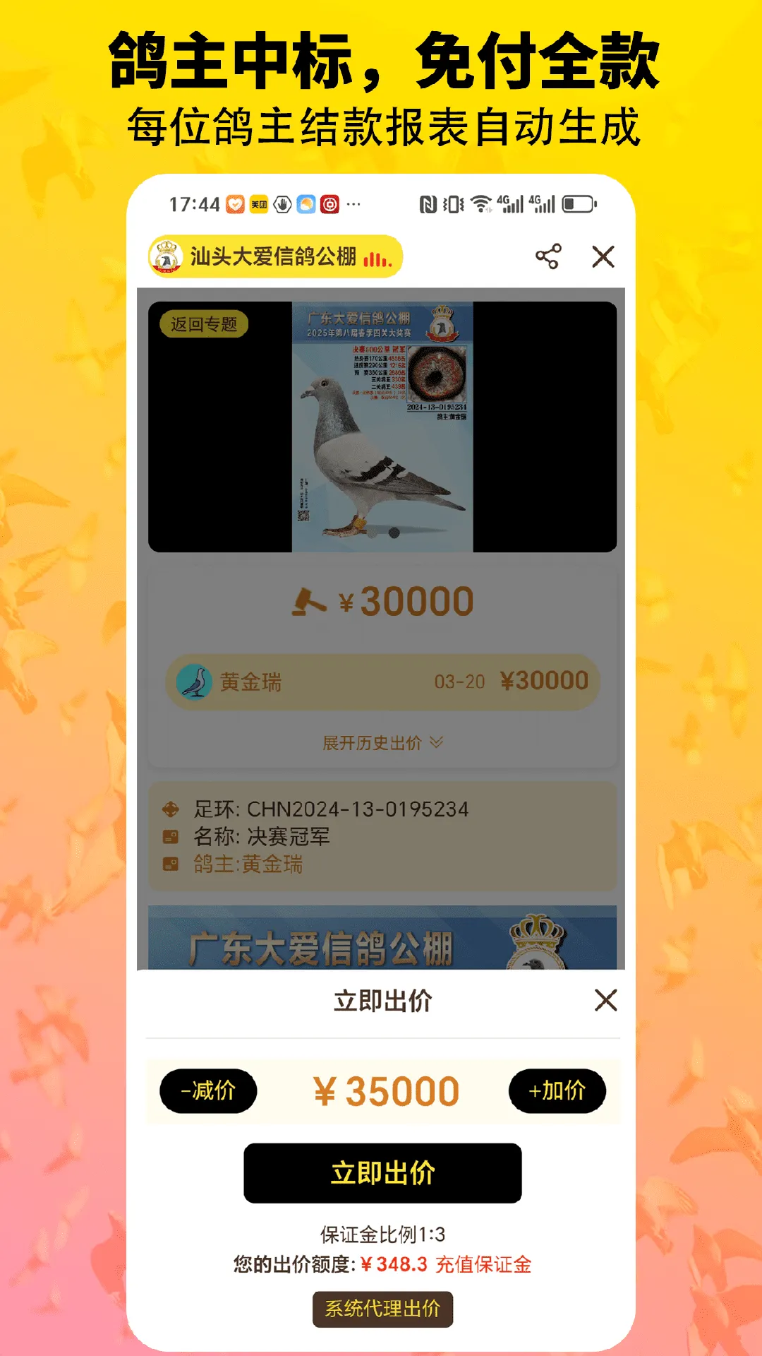 3. 在线交易功能强大,支持全球赛鸽行业交易,还有同步拍卖和高清直播,能让用户随时参与感兴趣的拍卖主题,实时查看物品详情。