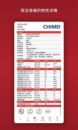 这款软件功能强大,精准搜索能力一流,输入性能信息就能快速匹配筛选出符合条件的材料。同一页面展示不同产品牌号与性能参数,方便对比差异。有本地缓存功能,无网络时也能查阅资料。支持组合搜索,还能通过社交平台分享材料资料。内置采购商城,商品品质有保障。汇聚全球众多化工厂物性数据,提供针对性性能搜索选项,还有独特计算功能,能助力产品研发。更新日志显示其不断优化,修复问题,新增功能,体验越来越好,强烈推荐你来下载试试!
