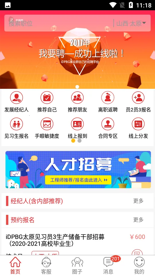 3. 功能全面多样,支持正式工报名、离职返聘,有经纪人功能、内部推荐、校园招聘、社会招聘、校企实习、线上报到、入职培训以及卡券功能等,为求职者和招聘相关人员提供便利。