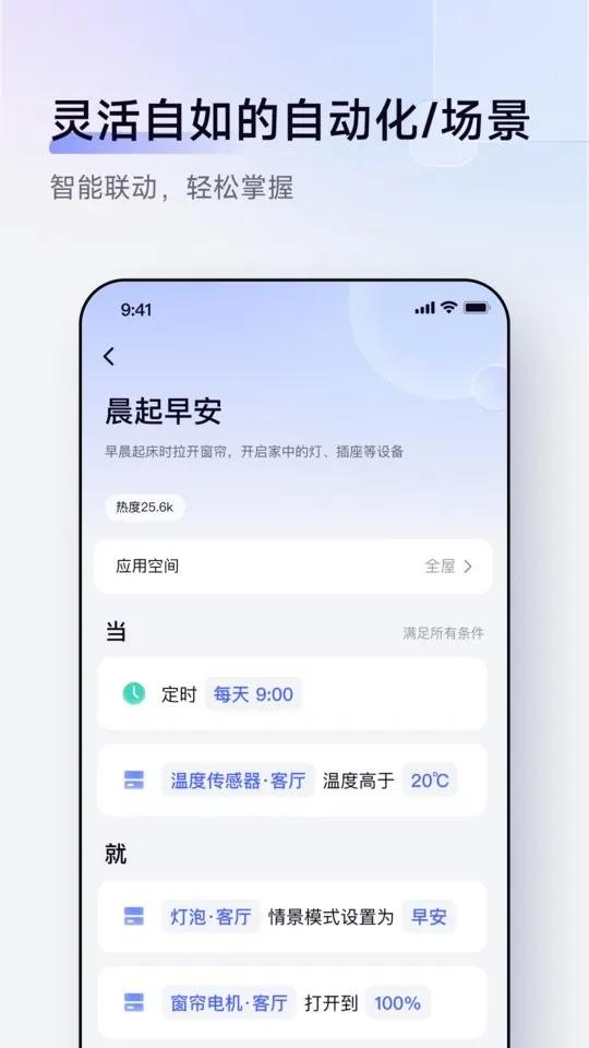 3. **场景智能**:生活场景一键批量执行设备动作,如回家前一键开灯开空调开电视;智能联动可快速设置,让设备自动执行预设任务,像有人开门闯入能响警报、拍照推送。