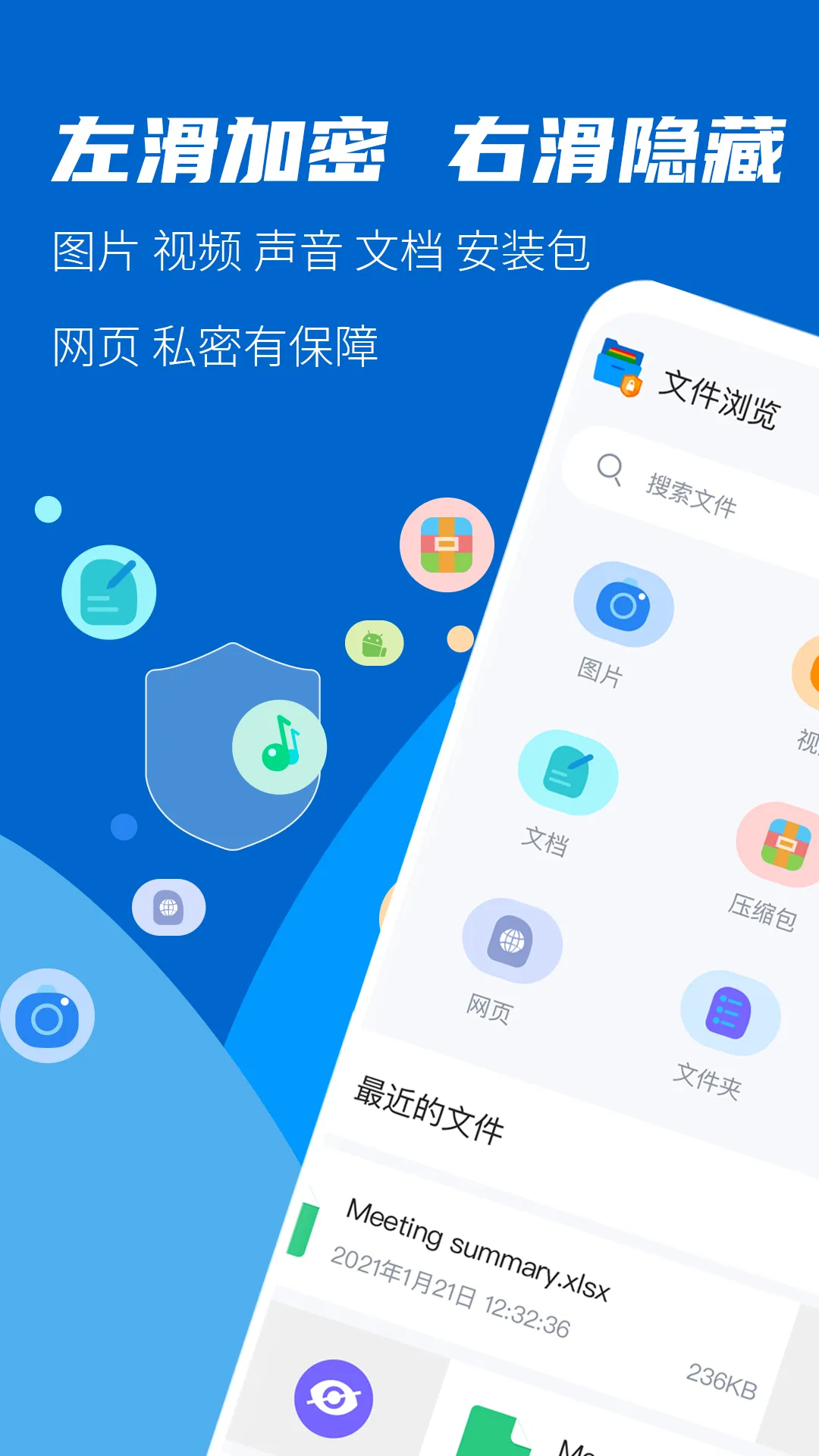 2. 支持全格式文件加密与隐藏,包括图片、视频、声音、word、excel、ppt、pdf等,隐藏情况下可在应用内查看。
