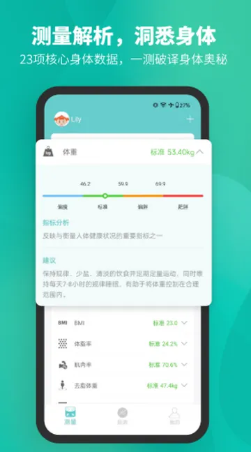 3. 它优势众多,数据精准,依托三十余年行业经验与大健康数据迭代,适配不同人种差异。操作便捷,蓝牙自动连接,测量完成数据实时同步。方案科学,饮食运动建议贴合用户身体数据与目标。