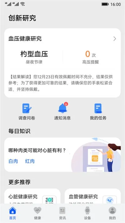 华为创新研究app汇聚多元化创新研究,全方位关注健康。配合穿戴设备,可实现健康管理,涵盖心脏、血压、血管等多项研究,还有健康知识科普,助您随时了解自身健康状况 。