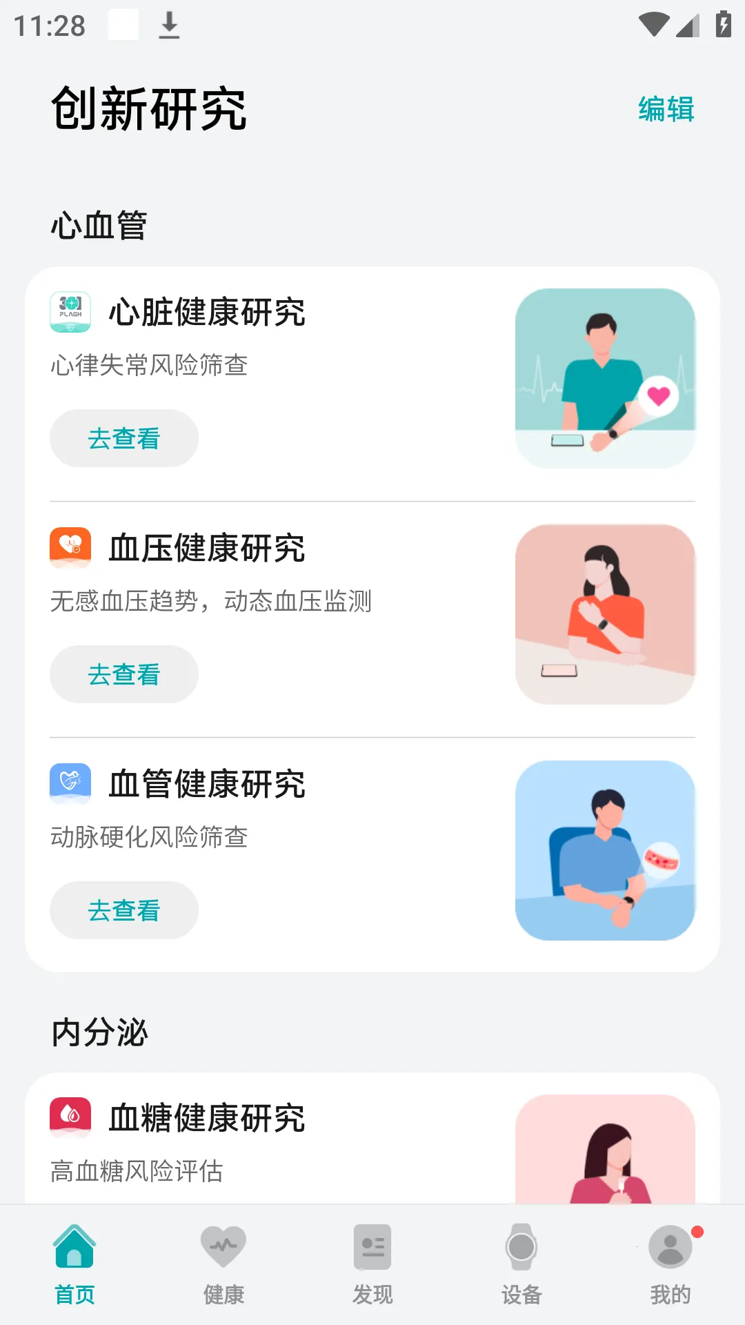 4. 通过华为创新研究APP,您还可以加入心脏健康研究、血管健康研究、肝脏脂肪研究等更多的健康研究项目,帮助您筛查并预防各类疾病风险,全面管理您的身体健康。