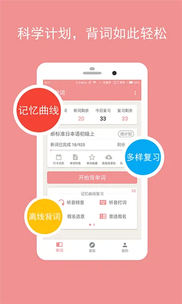 2. 采用曲线背单词模式,搭配多种复习形式,强化记忆留存,助力高效牢记日语单词。