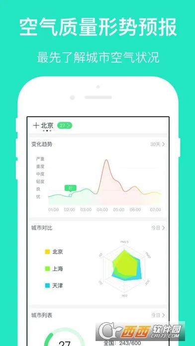 4. 城市空气质量状况实时发布,随时掌握关注城市的空气质量情况,向公众提供出行及健康指引,数据更新及时。