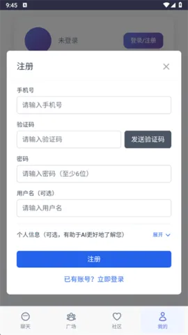 下载打开软件,点击右下角我的进入个人中心,再点击登录注册选项,按提示填写信息即可完成注册。