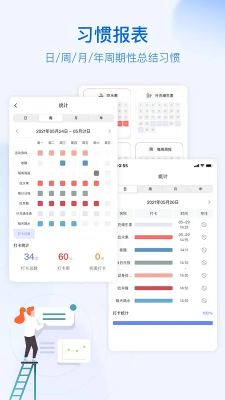4. 包含习惯打卡功能,能记录养成的习惯,生成详细打卡记录,方便回顾执行情况。