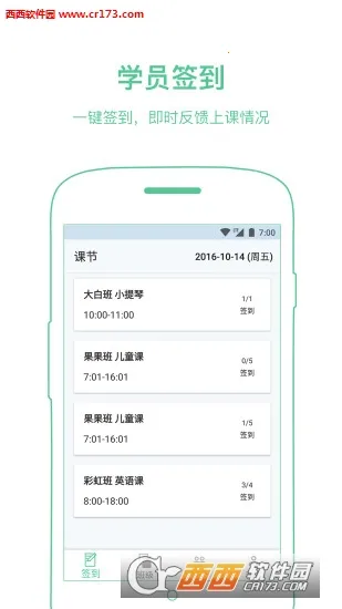 2. 操作便捷,支持一键批量签到,自动触发短信通知家长;通讯录一键导入学员信息,清晰展示各项记录;排课能自由设定多条件组合,还可随时调整删除。