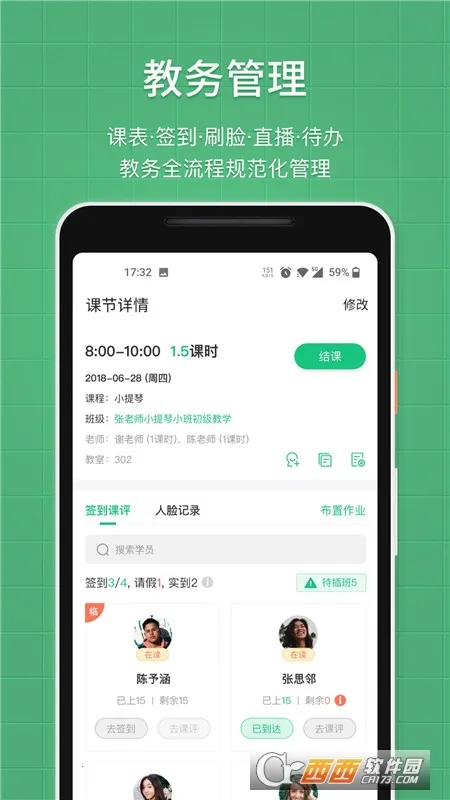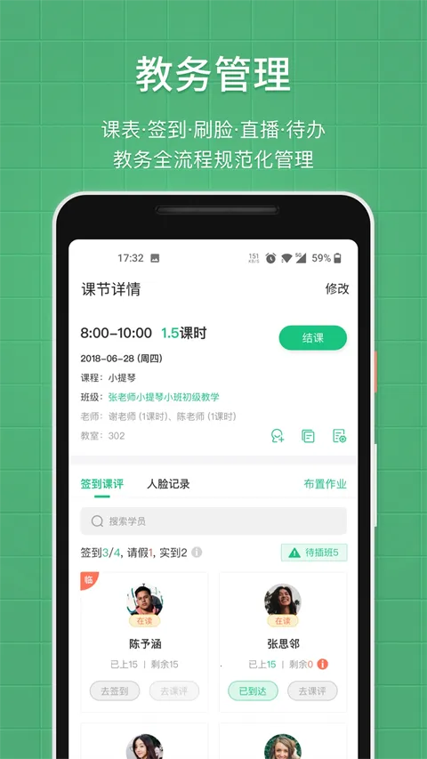 2. 智能:批量签到后系统自动向家长发送含课程名称、时间、教师信息的短信通知,考勤、消课、课评等环节无缝联动,减少人工干预。